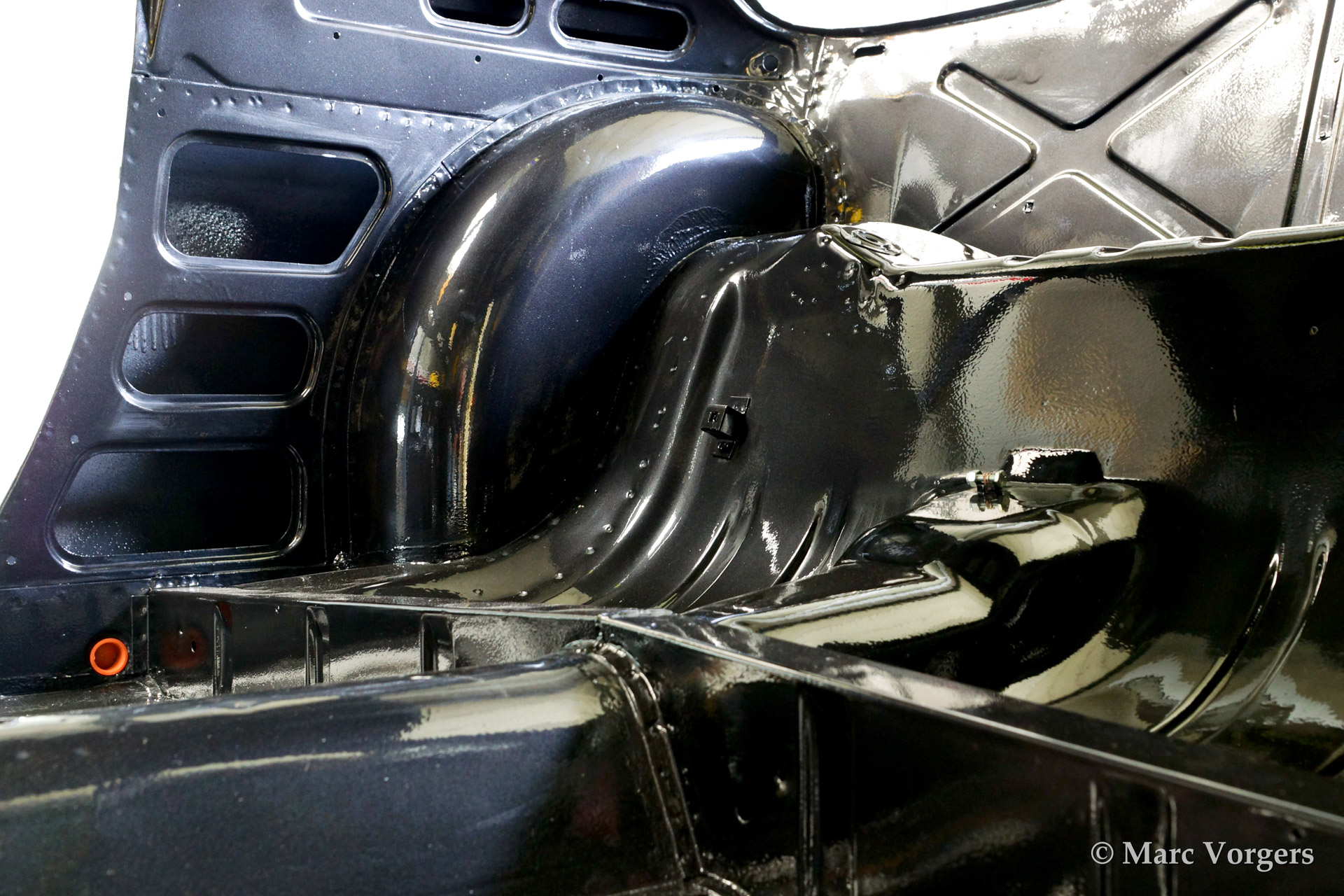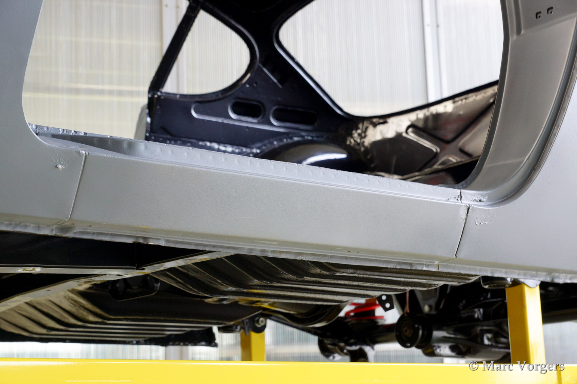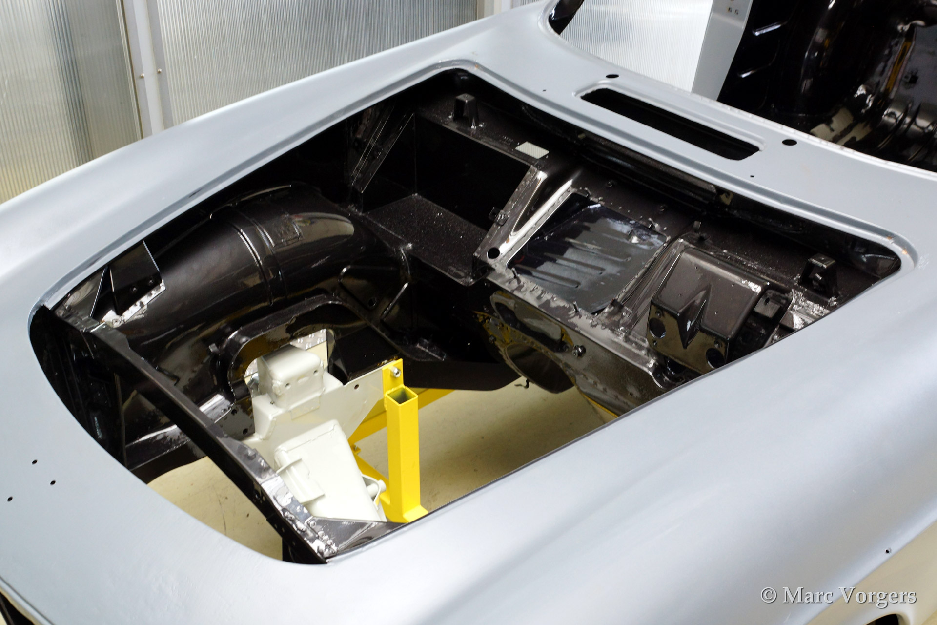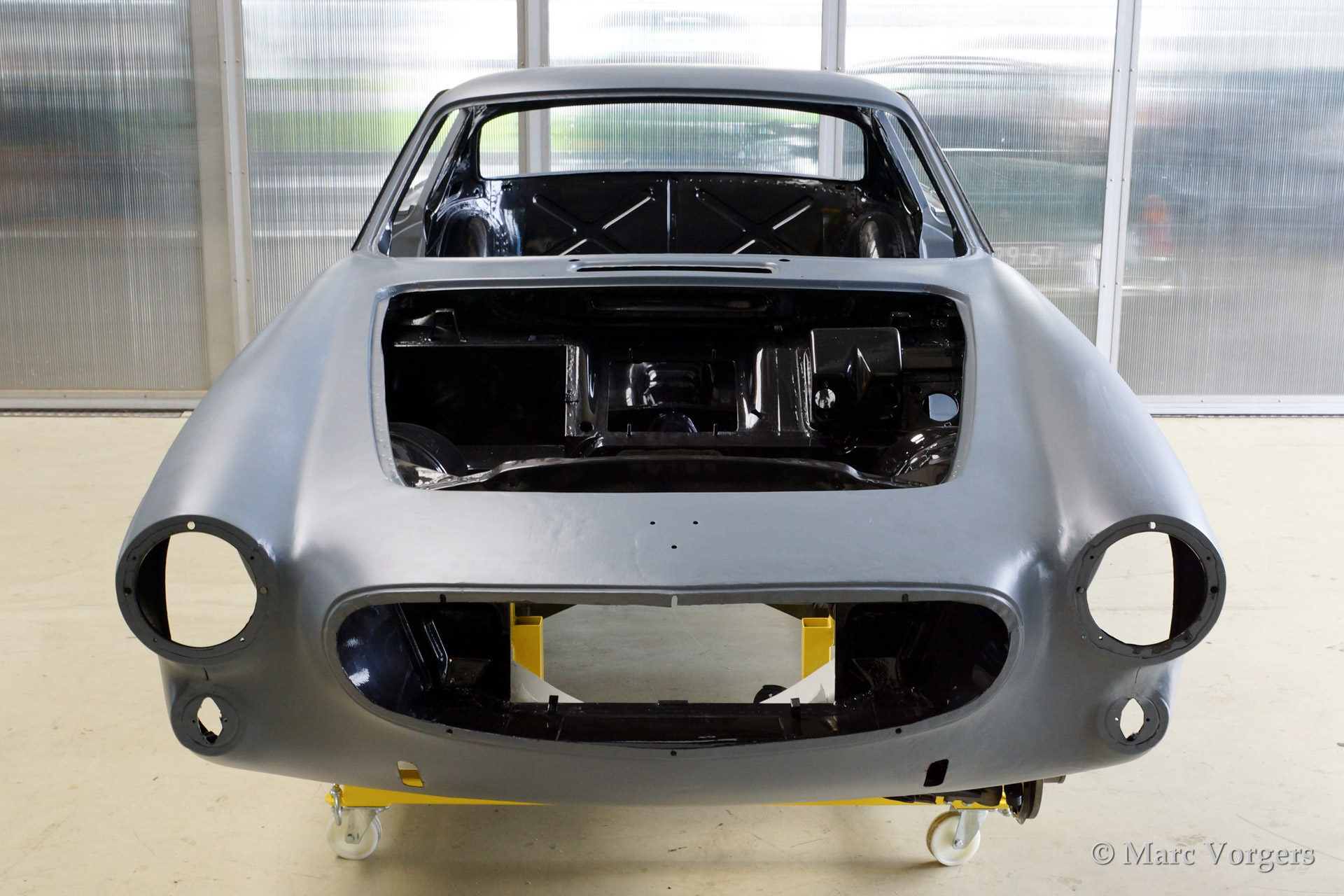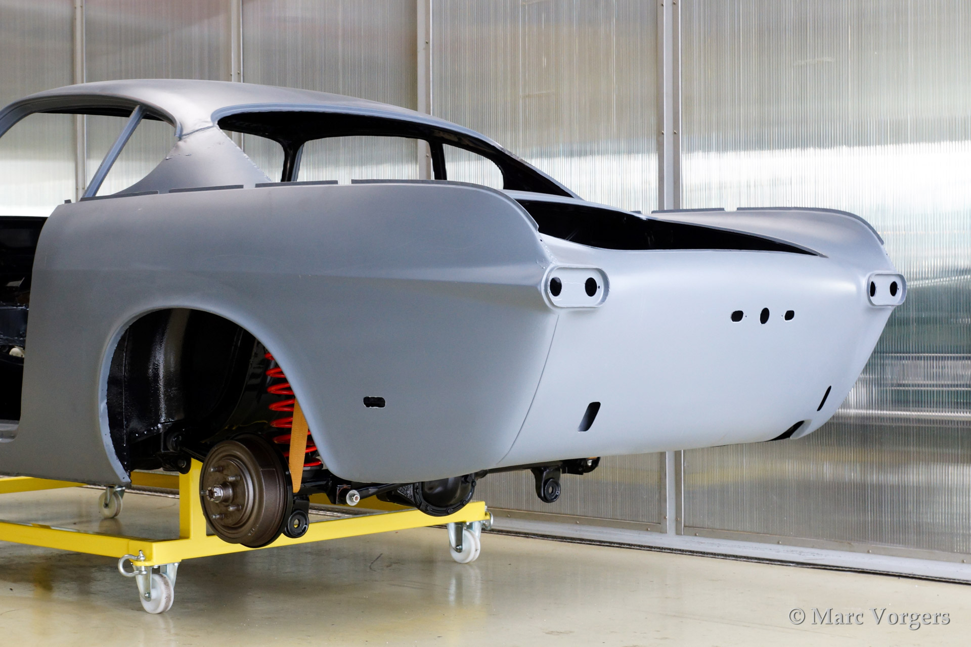 Volvo P1800 S full restoration. The car was stripped and the old paint fully removed. Then the bare metal was epoxy coated. The sheetmetal work was carried out and the body was sanded down before it received a layer of epoxy primer. The body was smoothened and primed (dark grey). The inside has been painted antracite metallic.