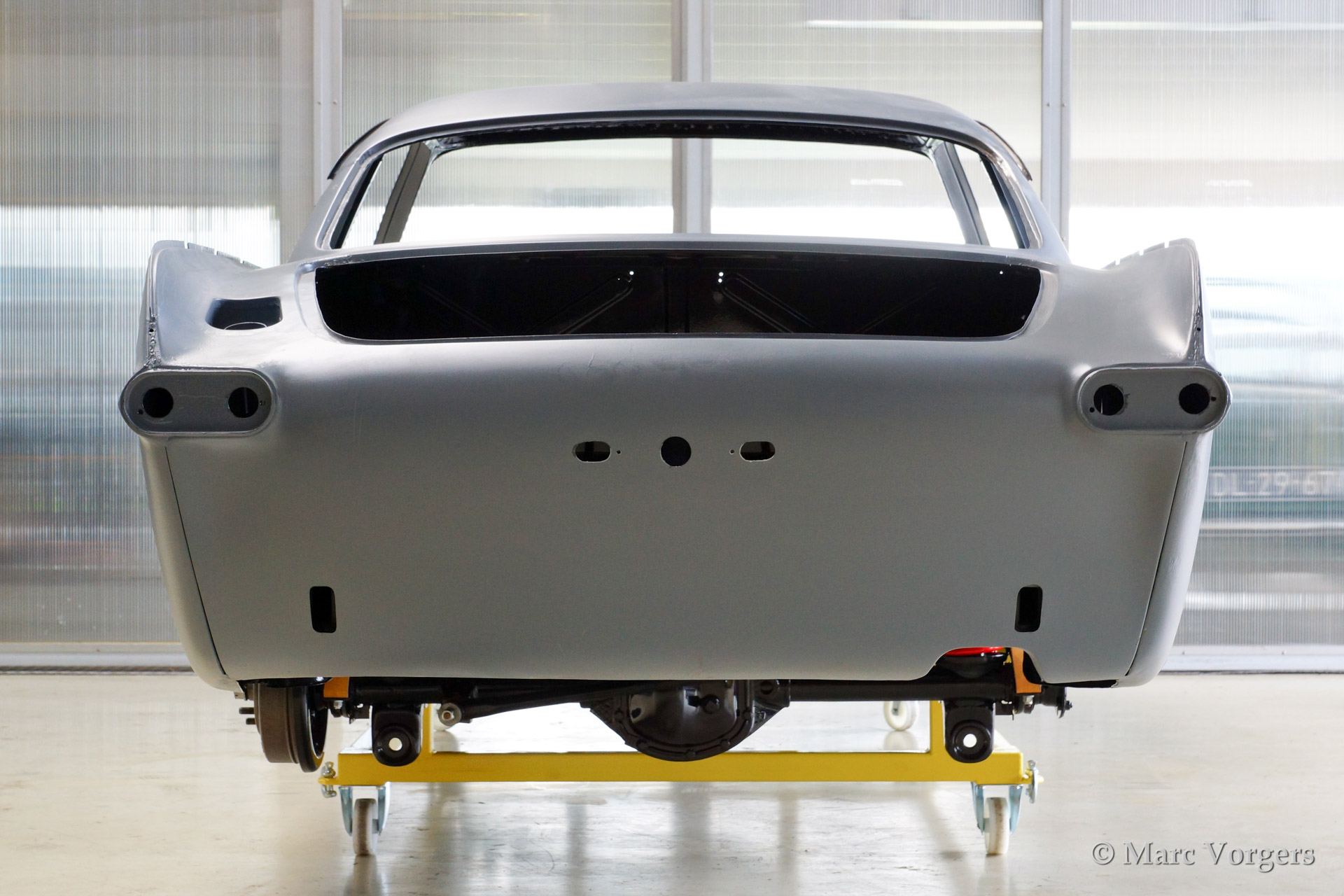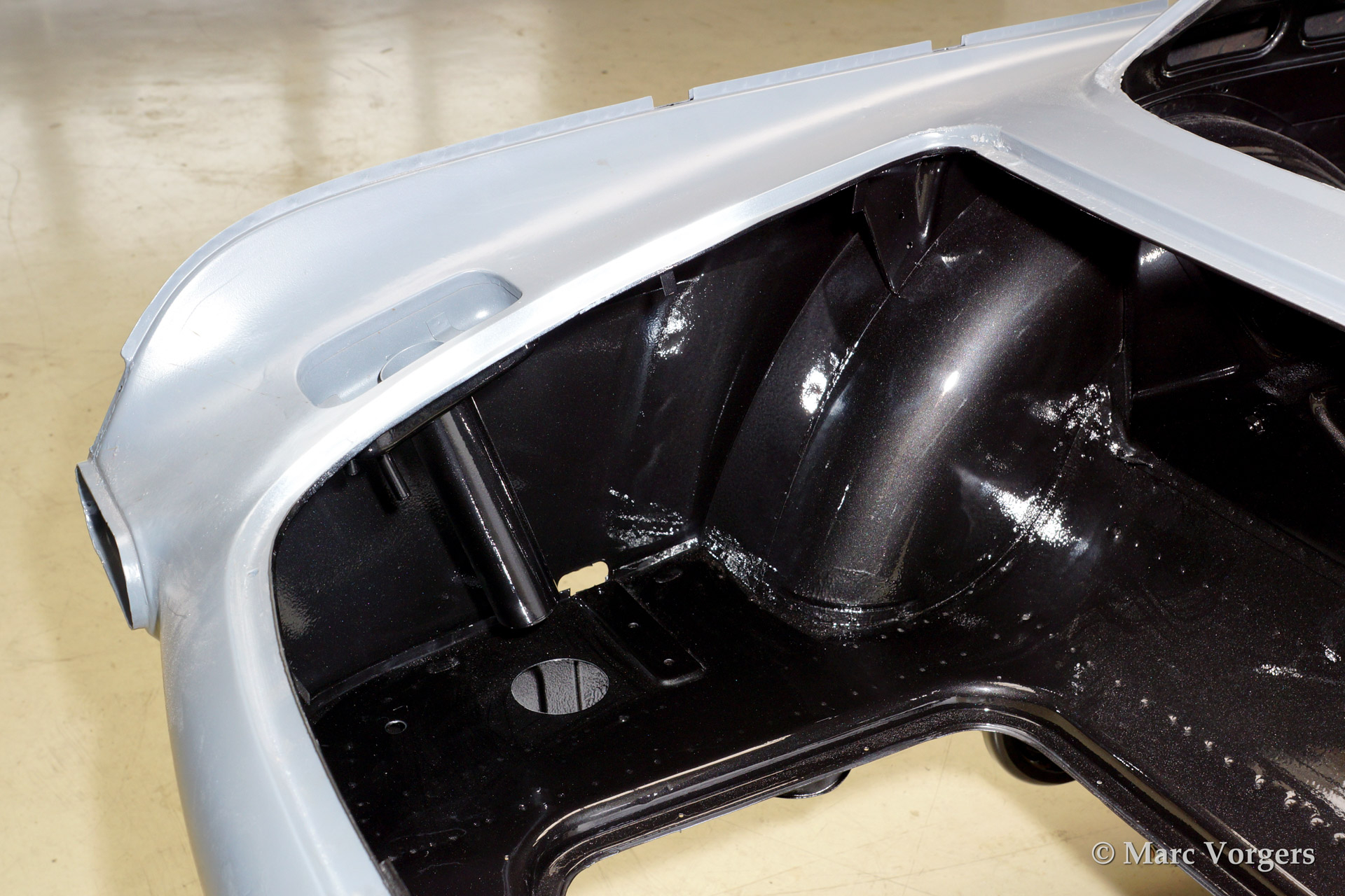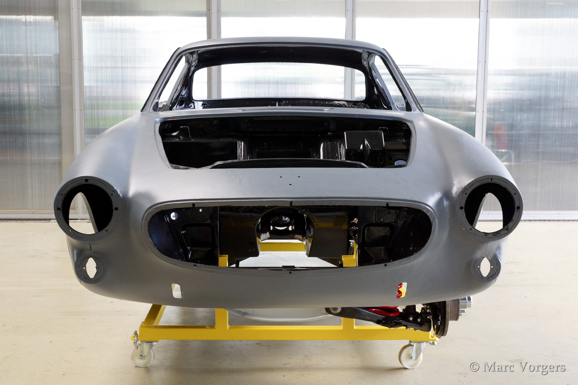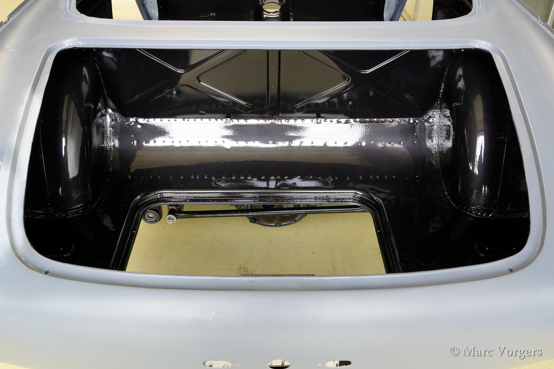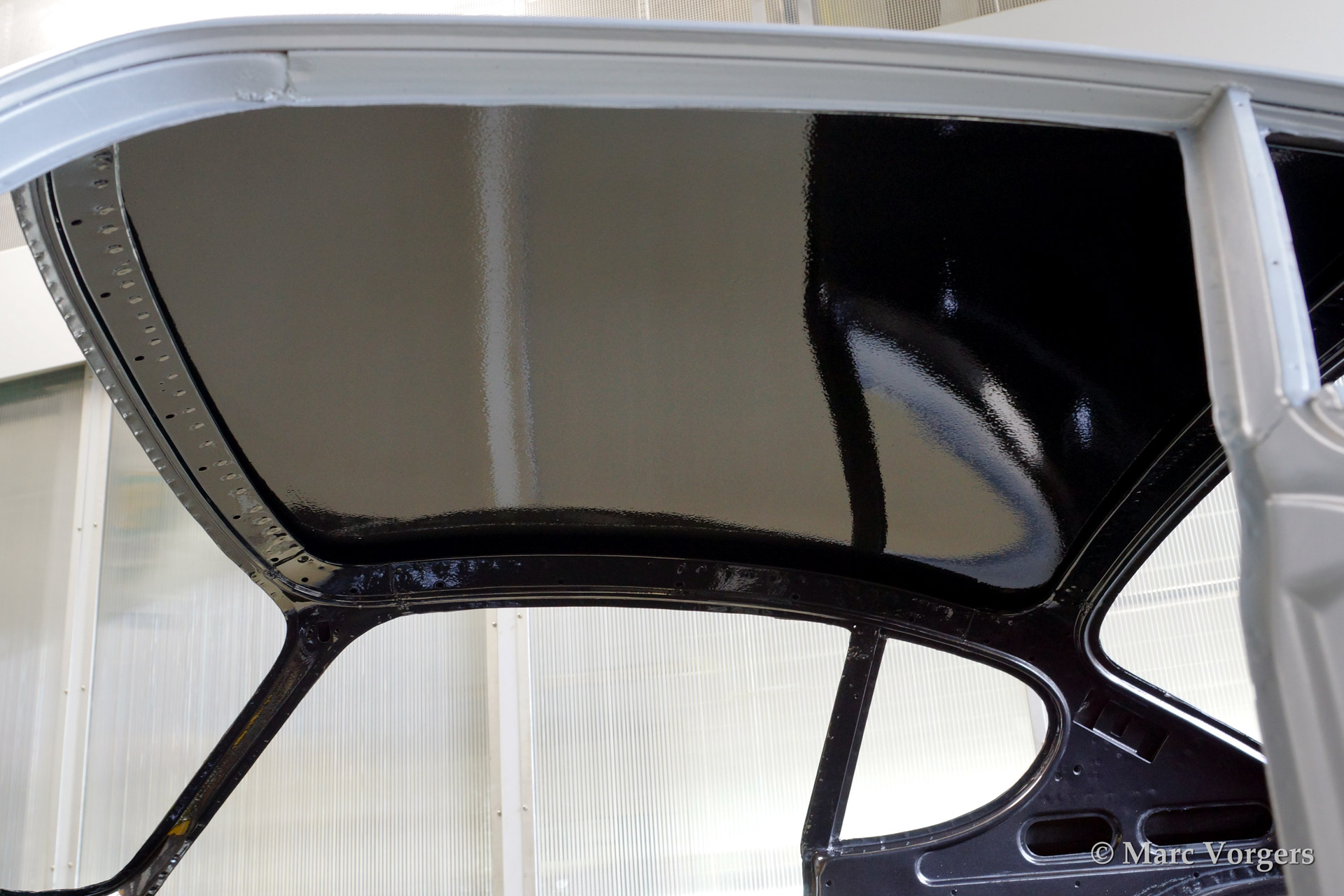 Volvo P1800 S full restoration. The car was stripped and the old paint fully removed. Then the bare metal was epoxy coated. The sheetmetal work was carried out and the body was sanded down before it received a layer of epoxy primer. The body was smoothened and primed (dark grey). The inside has been painted antracite metallic.