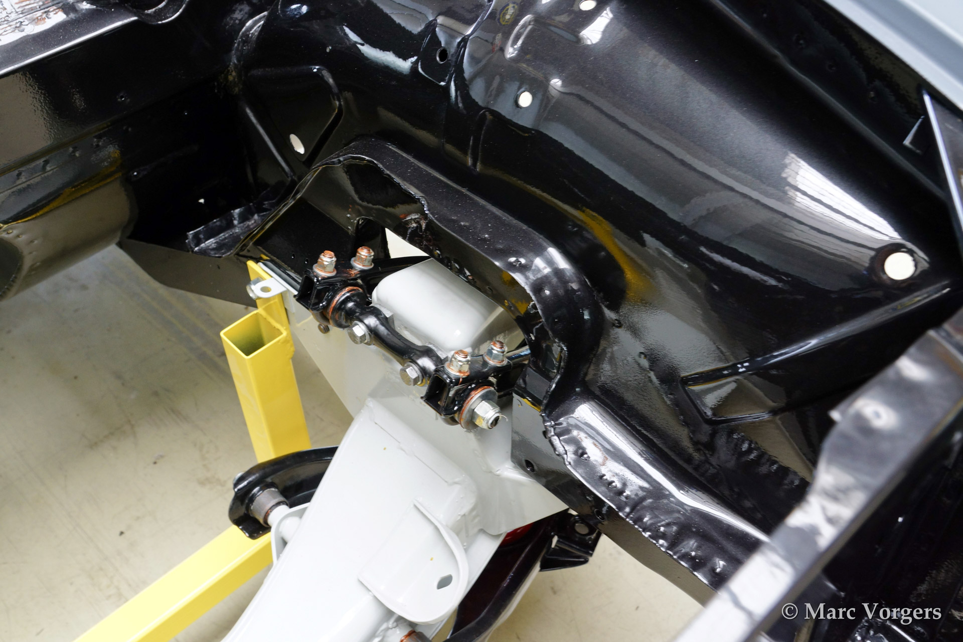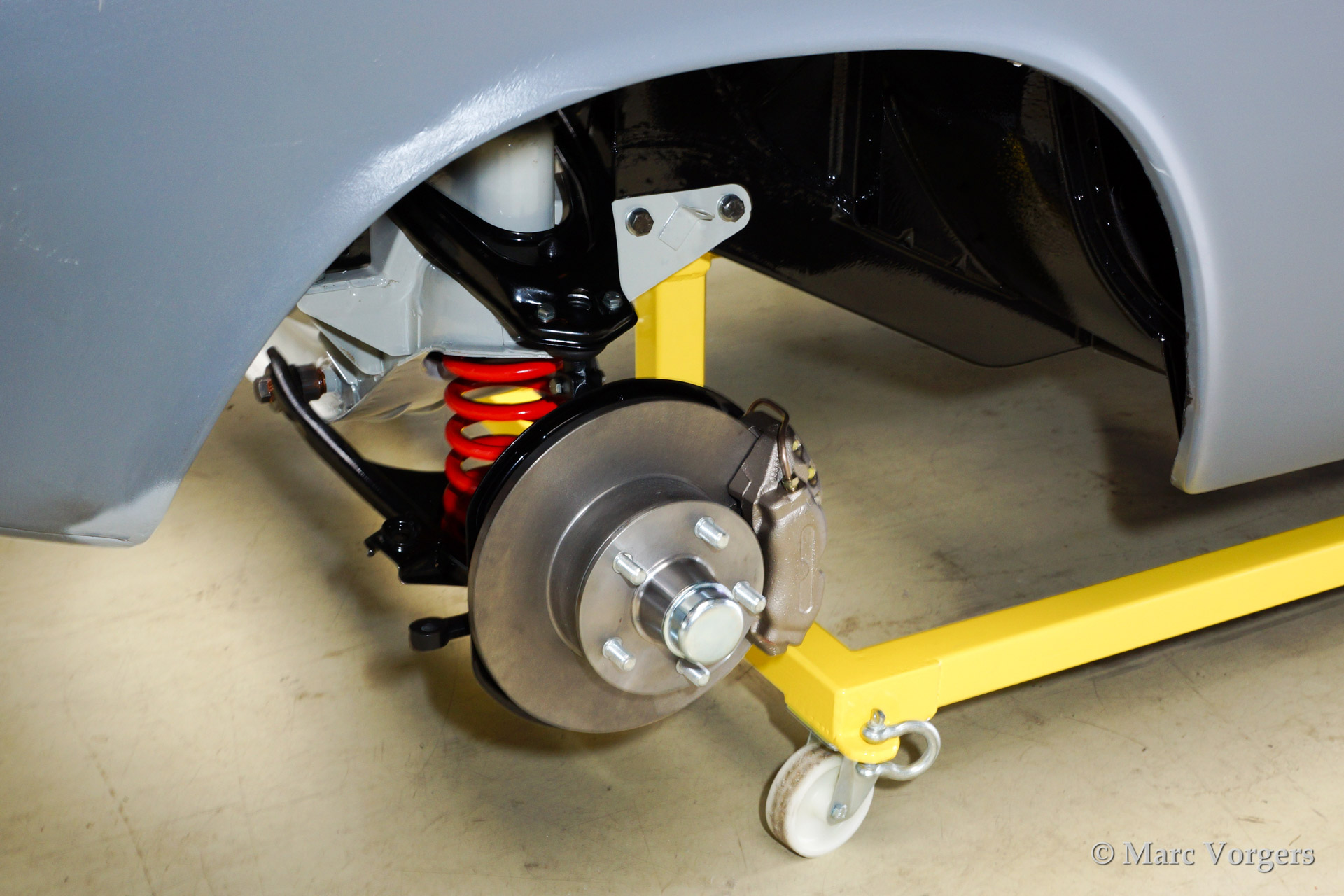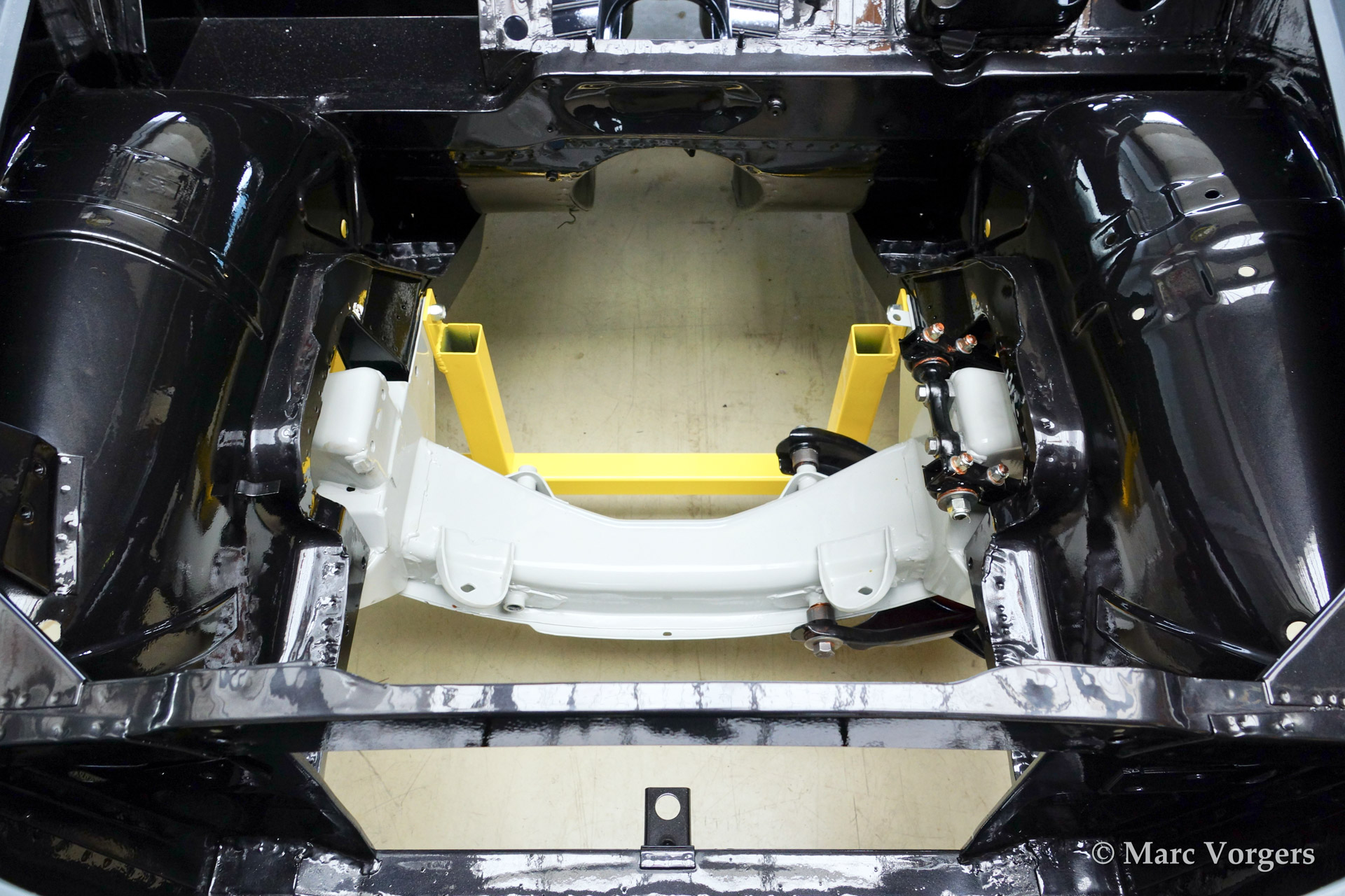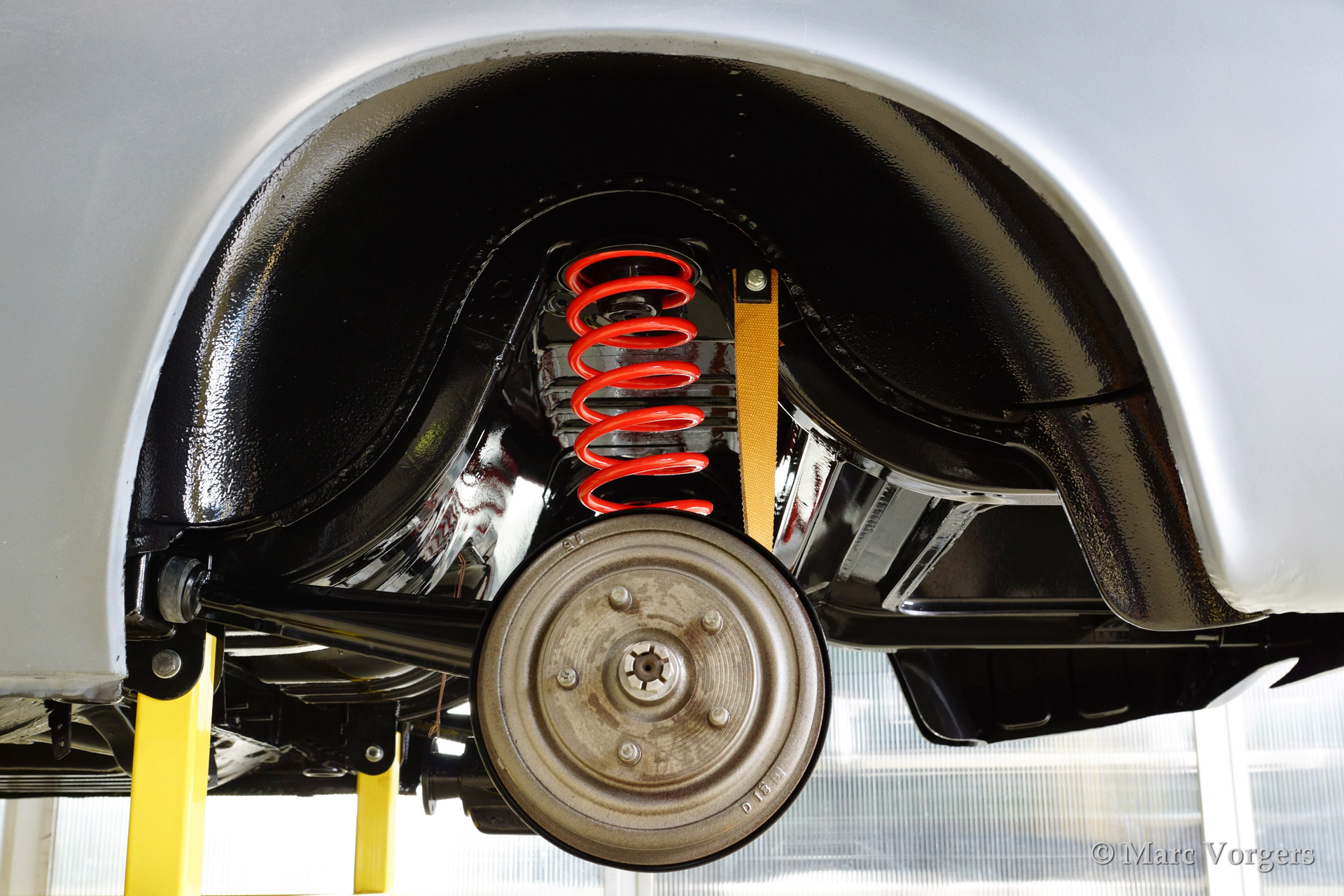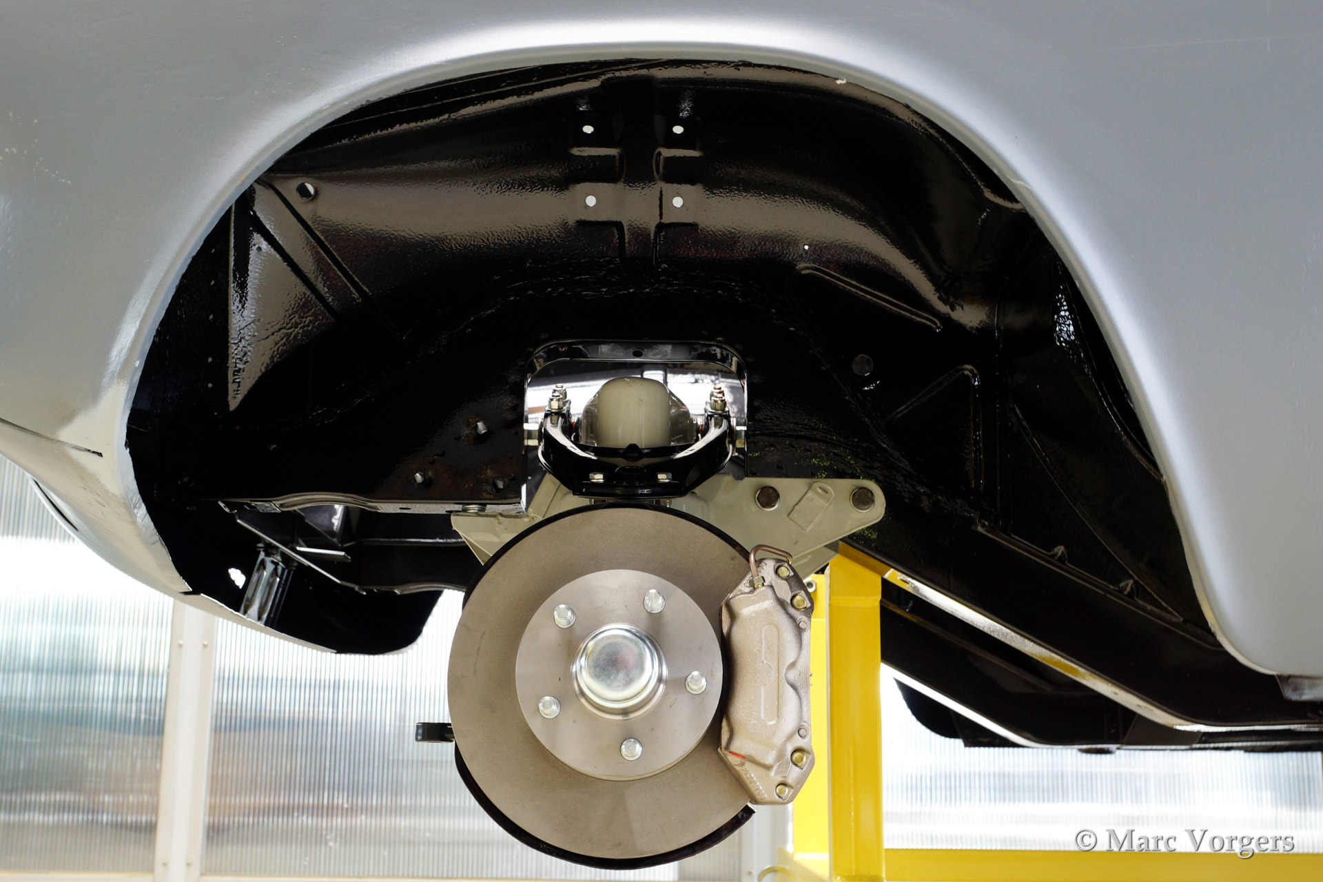Volvo P1800 S full restoration. The car was stripped and the old paint fully removed. Then the bare metal was epoxy coated. The sheetmetal work was carried out and the body was sanded down before it received a layer of epoxy primer. The body was smoothened and primed (dark grey). The inside has been painted antracite metallic.
